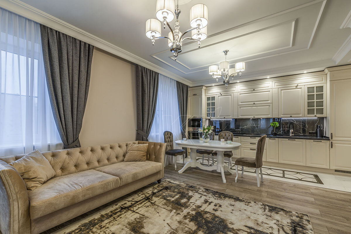 К ремонту собственного дома лучше проходить со всей ответственностью. А что может быть более ответственным, чем доверить ремонт опытному профессионалу! Дизайнер Александра Панько более пяти месяцев создавала интерьеры в доме своих заказчиков. Ей доверили всё: от черновых работ до подбора мебели и предметов декора. Кухней, достойной украсить этот роскошный проект, стала модель «Айвори» от компании «Кухонный Двор»! Строгая, красивая, благородная и очаровательная «Айвори» стала финальным росчерком пера в мастерски проделанной работе. Эта кухня обворожительна и полна загадок. Кажется, будто она имеет рамочные фасады с филёнкой, однако это не так. Фасады модели созданы из высококачественных плит MDF с «классической» прямоугольной фрезеровкой. В качестве покрытия используется высокопрочная эмаль, которая обеспечивает фасадам надёжную защиту от физических повреждений, высоких температур, влаги и солнечного ультрафиолета. «Айвори» стала образцовой кухней-гостиной, ее внешнос