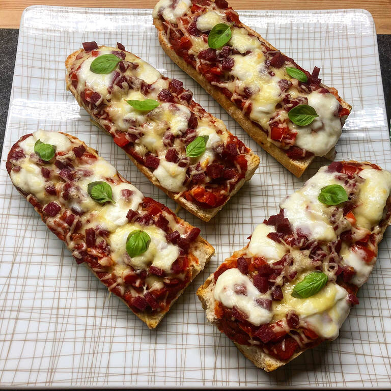 Ингредиенты Порции: 4 1 багет 2 помидора 200 г томатного пюре ¼ Ч. л. хлопьев чили 2 ч. л. базилика 1 чайная ложка сушеного орегано 1 ст. л. оливкового масла 70 г сыра Эмменталер 70 г сыра Буффало моцарелла Шаг 1/3 1 багет-2 помидора Разогрейте духовку до 180°C/360 ° F. Нарежьте помидоры небольшими кусочками и разрежьте багет вдоль пополам. Затем снова разрезать пополам, на этот раз по ширине. Шаг 2/3 200 г томатного пюре - ¼ ч. л. хлопьев чили-2 ч. л. базилика-1 ч. л. сушеного орегано-1 ст. л. оливкового масла-соль-перец Смешайте томатное пюре, хлопья чили, базилик, сушеный орегано и оливковое масло. Приправьте солью и перцем. Шаг 3/3 70 г сыра Эмменталер-70 г сыра Буффало моцарелла Переложите половинки багета на выстланный пергаментом противень и намажьте томатным соусом. Сверху положите кусочки помидора и базилика и посыпьте сыром Эмменталер. Разрежьте моцареллу на кусочки и выложите на багеты. Выпекать около 15 мин при температуре 180°C/360 ° F. включите функцию гриля и выпекайте