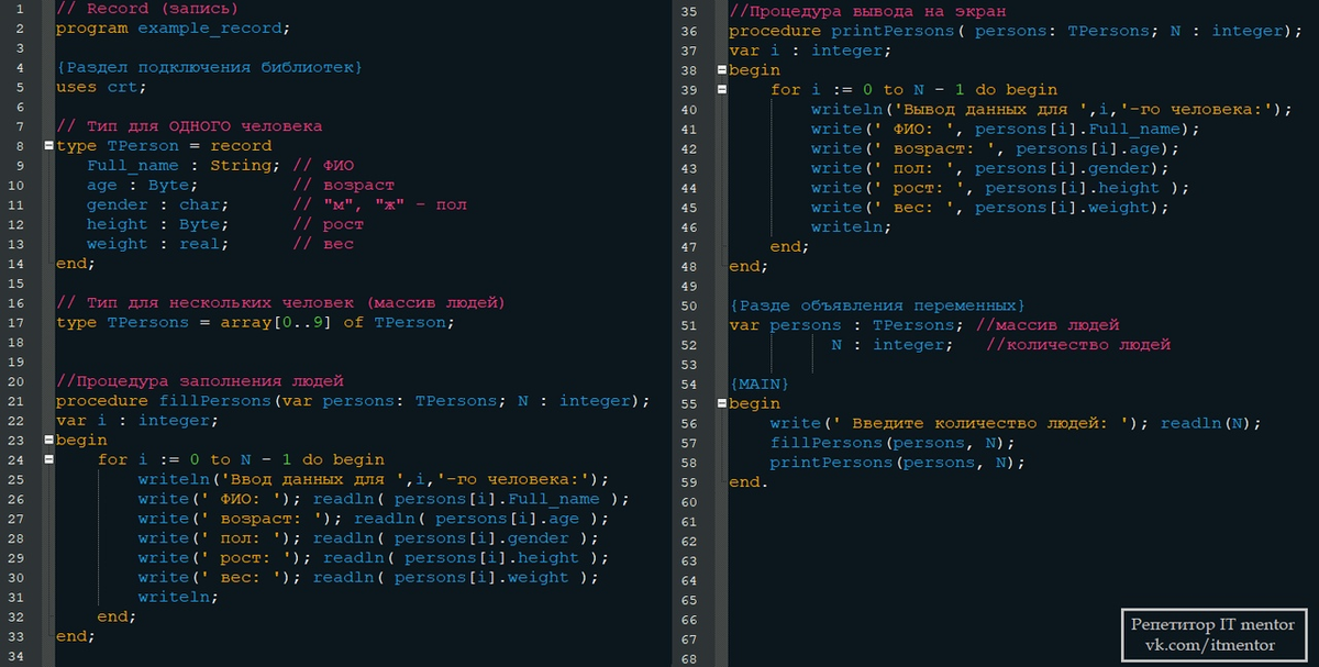 Для использования в программе множество однотипных данных используются массивы. Однако, очень часто возникает необходимость использовать разнородные типы данных для описания одного и того же объекта. В этом случае в программе используется тип, называемый запись. Запись – это структура, состоящая из фиксированного числа компонент, называемых полями. Данные одного поля разных записей имеют один и тот же тип, а разных полей могут иметь разные типы. Общий вид описания типа record: type t = record