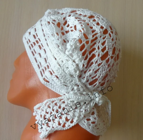 Девочки любят на голове хвостики. Мамочки надевают им на головы шапочки. Хвостики в них плохо смотрятся. Предлагаю связать панамку косынку. Хвостики наружу, голова прикрыта. Эта косынка удобна ещё и тем, что длинные волосы в любой причёске можно спрятать внутрь. Нам потребуется. Пряжа ALIZE BAMBOO FINE 100 г = 440 м, меньше 100 г, крючок №3. Описание. Вязать будем с самой широкой стороны. Набрала цепочку из 124 воздушных петель. В 6-ю петлю начинаю вязать по схеме. У меня это 50 см. Провязала без прибавок и убавок 8 рядов, начинаю убавлять в крайних раппортах с двух сторон. Для этого в девятом ряду середину вяжу по схеме, а в крайних фрагментах узора не делаю по 3 столбика с накидом в одну петлю. Косынка не будет треугольной. Очень удобная форма. Так постепенно убавляю. В один уголок пришила пуговицу. Застёгивать можно так. Можно связать отдельно повязку с завязками и пришить к косынке. Будет другой головной убор, без пуговицы, на завязках. По-современному — бандана, по-старинному
