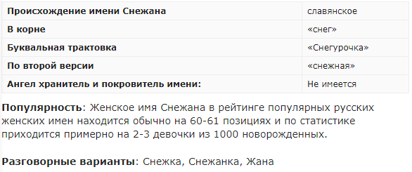 Женское имя Снежана является славянским по происхождению и сегодня одним из самых редких в странах СНГ. Образовано по главной версии от слова «снег» и трактуется как «снежная». Других версий не имеется на сегодняшний день. По статистике, это имя сегодня приходится на 2-3 девочки из 1000 новорожденных. Благодаря его редкости, оно имеет очень сильную энергетику. Совместимо с огромным количеством мужских русских имен, среди которых и такие как Максим, Давид, Степан, Артемий, Иван и Даниил. И кстати, обычно девушки по имени Снежана, это идеальные жены, матеря, и домохозяйки. Но они нуждаются в любви и уважении. И к слову, никогда такая не позволит превратить себя в бытовую рабыню. СМОТРИТЕ ВИДЕО - ПОДРОБНЕЕ ТУТ Источник - Значение имени Снежана: карма, характер и судьба