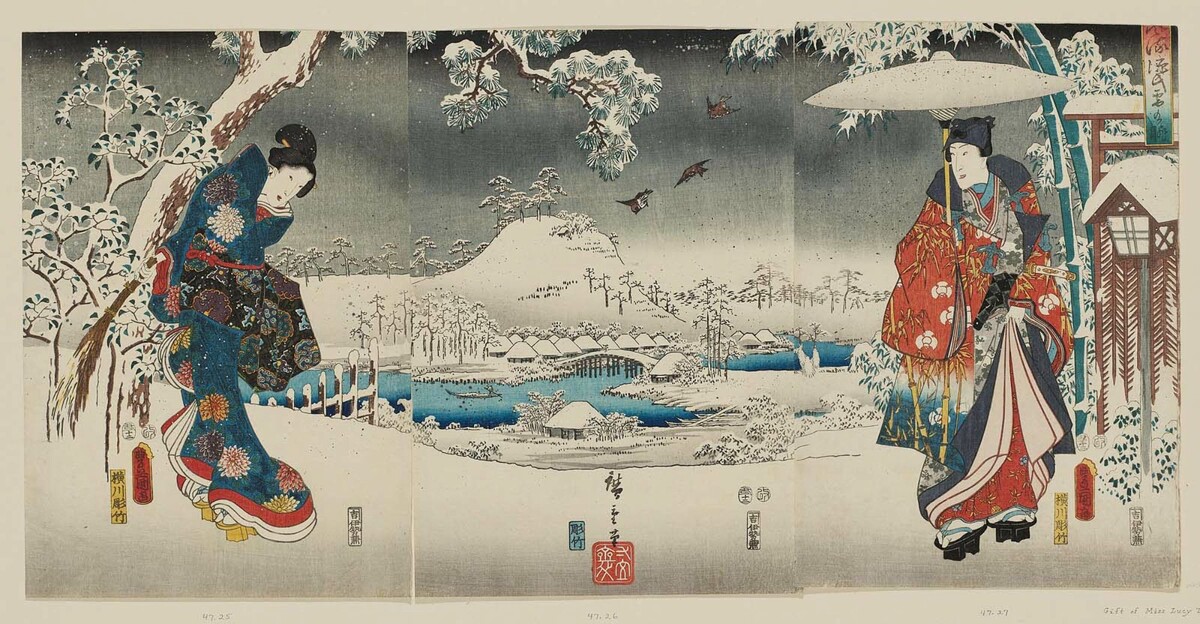 В жизни эти знаменитые художники укиё-э были хорошими друзьями и довольно часто сотрудничали. Триптихи, посвященные принцу Гэндзи, на мой взгляд - одни из самых лучших в ряду совместных работ Утагава Хиросигэ I (отвечал за пейзаж) и Тоёкуни III (главный по фигурам). В японской гравюре и живописи для такого сотрудничества использовался специальный термин - гассаку, который означал как несколько рисунков разных мастеров, выполненных на одном листе, так и единую художественную композицию, выполненную в соавторстве. Серия "Фурю (модный, современный) Гэндзи" была издана в 1853 году и посвящена на самом деле не принцу Гэндзи, а его литературному "двойнику" Мицуудзи из безумно популярного в конце эпохи Эдо романа Рютэя Танэхико "Лже-Мурасаки и деревенский Гэндзи" (издавался около 1829-1842 гг), довольно изобретательно пародирующий оригинальную "Повесть о Гэндзи". Интересно привести здесь слова Рютэя Танэхико в предисловии к одному из 38 томов романа, которые показывают его замысел: "Когда я