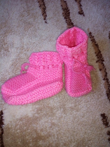 Розовые пинетки Нам потребуются спицы No2.5.Размер 80/86. 50 г. розовой пряжи 134/м Начинаем с левой детской пинетки Набираем на спицы 45 петель розовой пряжи и начинаем работу с платочной вязки-этот узор легкий для начинающих чайников. Он вяжется из одинакового вида петель 2 способами: лицевой ряд и изнаночный. Далее вяжем спицами платочной вязкой между кромками 12 рядов, затем через 6 рядов прибавляем петли для закругления подошвы на обеих внешних краях. А так же с двух сторон от средней петли,1 петлю, затем прибавления петель повторяем в каждом 2-ом ряду, еще два раза.Общих петель должно быть 57. Затем вяжем спицами между кромками 6 рядов лицевой гладью.Лицевую гладь вывязываем прямыми спицами, тогда получаются ровные рядочки и плотные. Далее вяжем 12 рядов платочной вязкой, для передней части откладываем с обеих сторон 24 петли и на оставшихся средних 9 петлях вяжем 16 рядов платочной вязкой, при этом провязываем с обеих сторон в каждом ряду последнюю петлю со следующей от