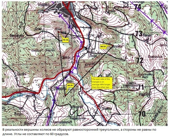 Холмы (Височица, Плешевица и Бу?ki - Visocica, Plješevica, and Bu?ki) представляет собой равносторонний треугольник. “Каждая сторона треугольника измеряется приблизительно 2170 м (с погрешностью менее 2%), а внутренние углы треугольника измеряются 60 градусами.”