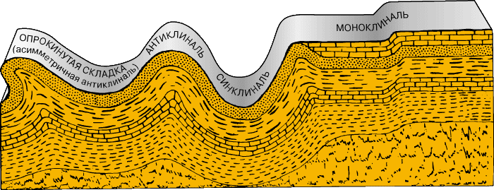 Виды складок (с геологическими терминами) вверху. Типичная синклиналь внизу.