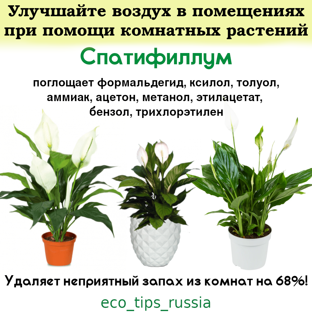 Спатифиллум поглощает формальдегид 805 мкг/час, ксилол и толуол 262 мкг/час, аммиак 1410 мкг/час, ацетон 4865 мкг/час, метанол 13 940 мкг/час, этилацетат 2315 мкг/час, бензол 1831 мкг/час, трихлорэтилен 1032 мкг/час.