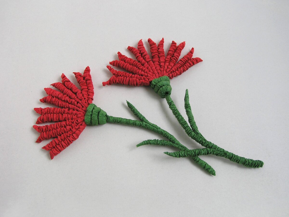 К юбилею Победы сделаем красные гвоздики из гофротрубочек. Скрутим три красные и две зелёные гофротрубочки. Длина красных гофротрубочек - 10 см. Немного раскроем гофротрубочку, капнем клея в середину и сожмём пальцами. Сложим трубочку уголком - капнем клея в сгиб и сожмём. Когда клей высохнет, срежем кончик наискосок. Три детали для гвоздики готовы. Склеим сначала две, потом добавим третью.. Зажмём их прищепкой и подождём... Разрежем зелёную гофротрубочку на две одинарные. На трубочке для стебелька подклеим неровный край среза. С оборотной стороны цветка нанесём клей. Приклеим стебель. Вторую одинарную трубочку подклеим с изнанки и обернём ножку цветка три раза. Каждый оборот фиксируем клеем. С изнанки трубочку сплющиваем, а с лицевой стороны стараемся её не деформировать. Подрежем кончики лепестков. Приклеим листочки. Гвоздики бывают розовые, белые, оранжевые... Сделаем ещё ленточку Возьмём три оранжевые и две чёрные гофротрубочки. Раскроем немного оранжевую, а чёрную разре
