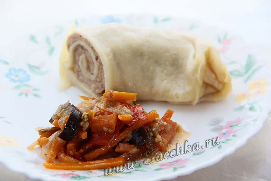 Ханум - блюдо узбекской кухни, представляет собой нечто вроде мантов: начинка заворачивается в тесте, так и варится на пару в виде рулета. Готовится достаточно просто и легко. У нас сегодня ханум с фаршем. Ингредиенты: Тесто: Начинка: Как приготовить: