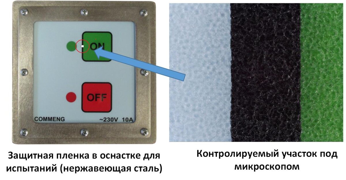 Нужны были данные о воздействии не просто щелочей, кислот, спиртов, а именно моющих и дезинфицирующих средств. Так как подходящей методики испытаний не нашли, разработали свою. Идея состояла в том, что производится многократная обработка поверхности с использова-нием различных средств, и после каждой серии производится контроль для обнаружения изменений или их отсутствия. Для визуального контроля используется микроскоп с 300-кратным увеличением.