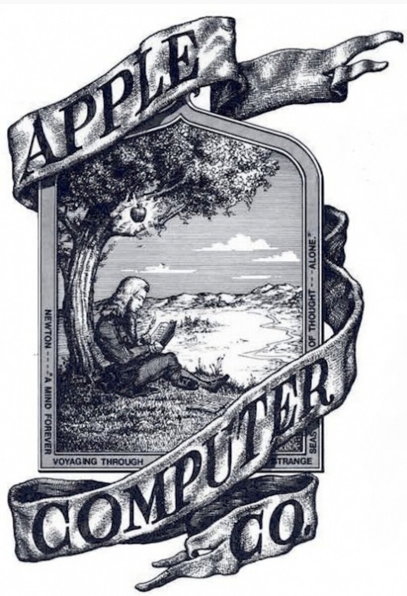 Наверное, самый известный логотип Apple — это разноцветное яблоко. Сейчас именно он считается винтажным ретро-знаком Apple, хотя официально первым было далеко не яблоко. На самом первом логотипе Apple был изображен Исаак Ньютон, сидящий под яблоней — незамысловатый сюжет легенды про открытие сэром Исааком силы всемирного тяготения.