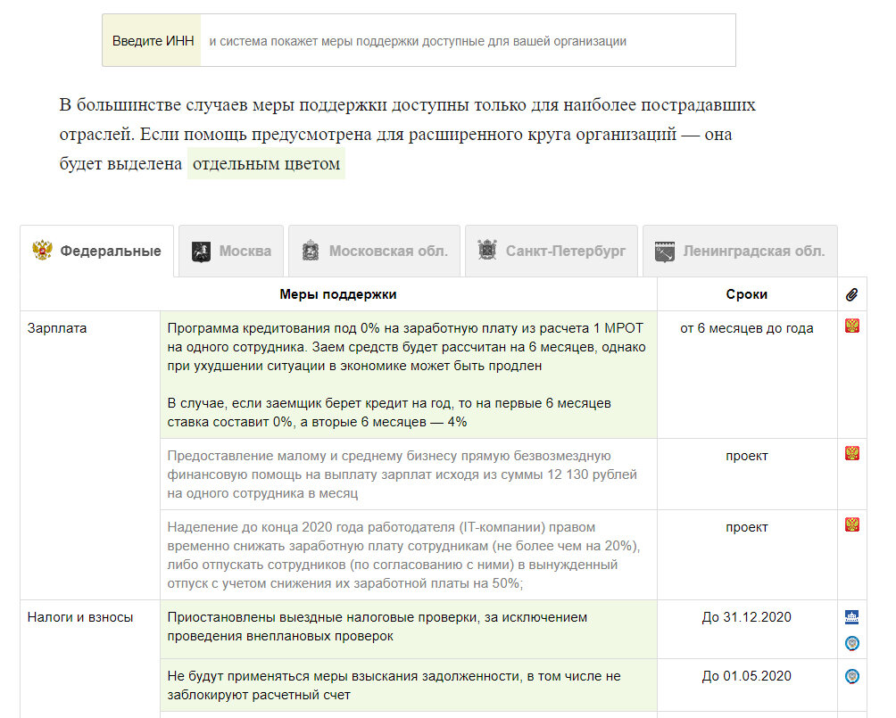 Неделя работы по 15 часов. Перечитано несколько десятков постановлений, распоряжений, указов. Все систематизировал, написал код, который по ИНН компании определяет ее вид основной деятельности, регион и показывает меры поддержки бизнеса которые предусмотрены именно с учетом региона и вида деятельности https://alexlobanov.ru/mery-podderzhki-biznesa-iz-za-koronavirusa/ Прямую выплату без всего я заметил только в Ленинградской области. Там даже самозанятым выплачивают 7000 рублей (ну хоть так), а ИПшникам 7000р + по 5000 рублей на ребенка. Все однократно, естественно. Друг, вот, получил, как самозанятый, при этом налоговая долго думала (10 дней), звонили и говорили "Ага! у вас ведь ООО есть!!!11" При этом ООО признано налоговой как недействуюшее и подлежащее исключению из реестра. Потом попросили прислать чек, какой нибудь, что деятельность ведется (это к вопросу о едином окне и взаимодействию центра занятости и налоговой). Но в итоге прислали В Московской области (точнее на сайте П