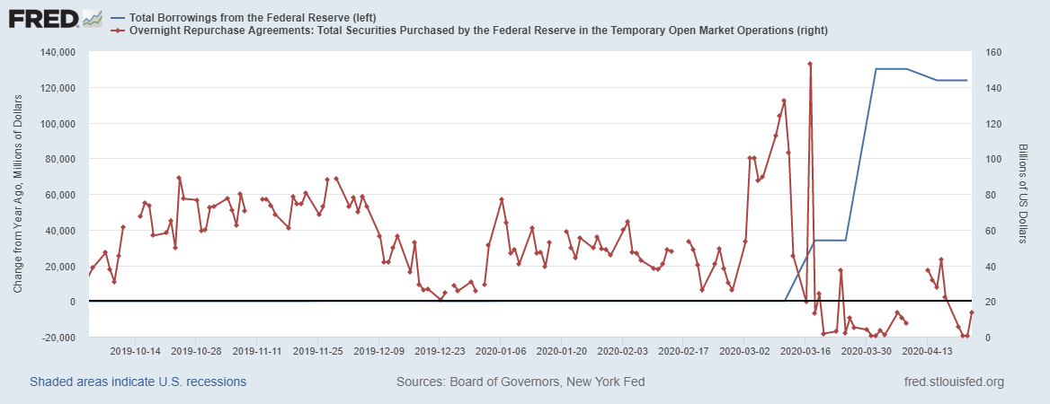 Начнем с обзора спроса на долларовую ликвидность со стороны финансовых институтов, пользующихся сделками РЕПО и прямым кредитованием у ФРС