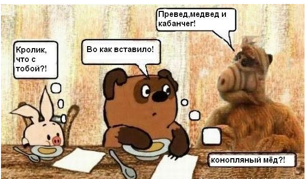 1. Девушка — парню: — А поцеловать? — Куда?! — Под хвостик. — В жопу, что ли?! — В шею, тормоз! На голове хвостик! ! 2. Винни-Пух — Пятачку: — Хочешь, научу французскому? Пятачок, обрадованно: — Конечно! Винни разбегается, на ходу кричит: «Парле ву франсе?» — и бьет Пятачка сапогом в бок. Пятачок: — Уииии-иии-ии-и! 3. Вовочкин папа едет в Ленинград. — Дети, кто сочинит стихотворение со словом "Ленинград", тому я привезу то, что он в стихотворении попросит. — Папа едет в Ленинград, папа купит мармелад, — говорит младший брат Вовочки. — Молодец, куплю тебе мармелад. Вовочка: — Папа едет в Ленинград, папа купит мне мопед. — Не в рифму! — кричит папа. — Попробуй еще раз. — Папа едет в Ленинград, Мамин хахаль будет рад. Мамин хахаль наш сосед, Папа купит мне мопед. 4. Приходит мужик домой в 2 часа ночи, пьяный. Жена его встречает с гневом: — Иди туда откуда пришел! Муж достает телефон, набирает номер и говорит в трубку: — Ну, все нормально, Колян. Я отпросился! 5. — Коль, а ты меня обижать
