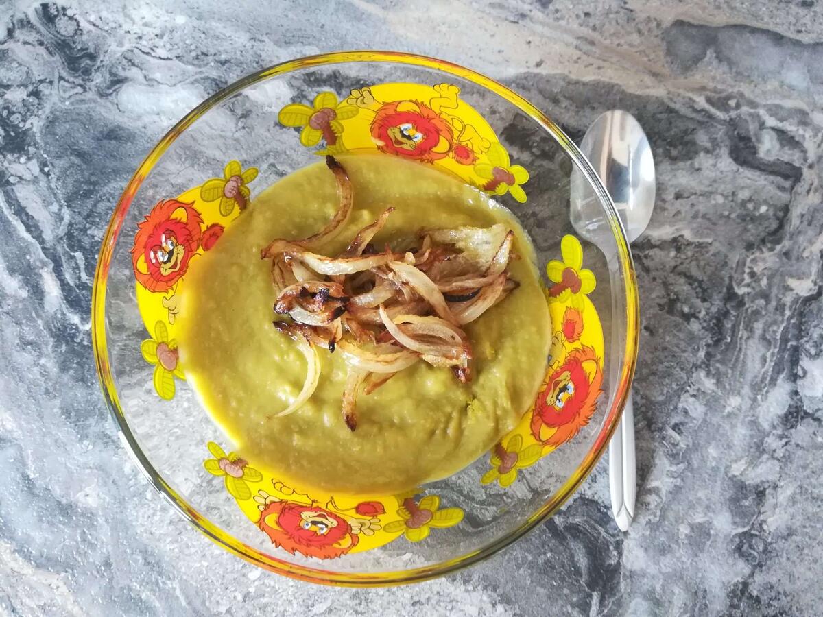 - Добавить к луку горох и на среднем огне парить, иногда помешивая. Если жидкость сильно испаряется, можно немного подлить воды или бульона