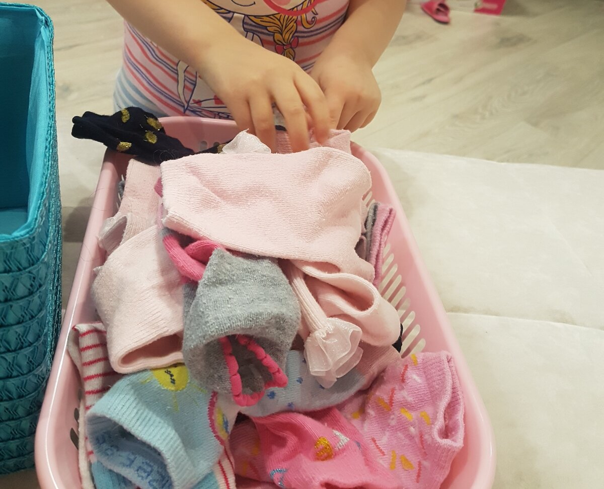 Конечно же сейчас речь пойдет не о её носках, а об одном из методов развития маленьких детей! В развитии детей от 2 до 4 лет важным моментом является наведение порядка. Согласитесь, это ужасно раздражает, когда ты целыми днями убираешь на место игрушки, вроде только пропылесосила, а уже какой-то мусор на ковре или когда на только что помытый пол капает из трубочки вишневый сок! Меня очень спасают коробки от подгузников! Нет, Ева уже давно спит без них, но в свое время я их покупала коробками и сами коробки просто не выбрасывала. Теперь мы в них храним игрушки. В каждой комнате у нас стоит одна или две коробки, в которые можно БЫСТРО сложить весь бардак! Это очень удобно!