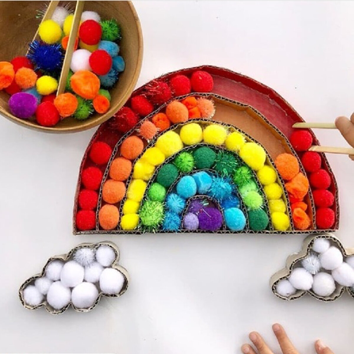 Потребуется картон, краски/фломастеры , помпоны и пинцет. Из картона клеим радугу, можно просто нарисовать границы на картоне и вырезать, каждый сегмент радуги красим в цвет. Смысл игры очень прост - раскладывание помпонов по цветам. Можно раскладывать пинцетом или пальчиками, тем самым ещё и развивается захват
