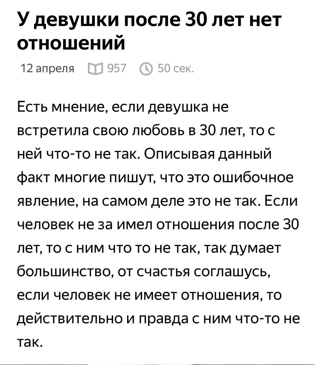 Попалось тут в обсуждениях. Что не так с моей точки зрения? Сначала ознакомимся с оригиналом. Я всё жду когда кто-то объяснит, что это за рубикон такой- «30 лет». Почему только для женщин и почему именно 30? Не 40 или 60? Как человек, уже прошедший скажу, что 25,28,30 и 33 отличались лишь годом. То есть наутро после тридцатилетия не упала грудь до пупа, не шибанула молния и не стали окликать «Эй, старушка!». Ничего не изменилось. А возрастной кризис -вещь вообще индивидуальная: кто-то их проходит не замечая, кто-то переходит из одного в другой не вылезая,кто-то ни одного не заметил,но в 60 вдруг цепануло. Собственно что такое кризис? Это когда по-старому жить надоело/не можешь/не хочешь, а по-новому ещё начал/не понял как. Спойлер: если заниматься своим делом, не слушать общество и не давить себя ни в чем, то кризисов и не будет. Правда настолько идеальные варианты в жизни встречаются редко. Теперь перейдём к пресловутой женской избирательности. Типо после тридцати надо хватать все