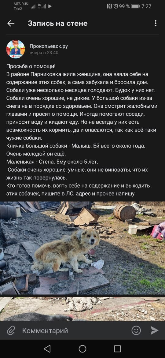 Может быть мелковато покажется на скриншоте, поэтому я повторюсь. Женщина завела себе двух собак, пару котят и ушла в запой. Качественно и надолго. У собак нет крыши над головой.Три месяца им нечего есть и пить. Соседи сжалились над бедными животными, иногда подкидывают им что придётся. Но этого мало. Им нужно сбалансированное питание и уход. Большая собачка (Малыш) получила много увечий от зимы. Он несколько раз примерзал к земле. Стал сильно припадать на лапы. Ему срочно нужно обследование. Ему нужен дом.