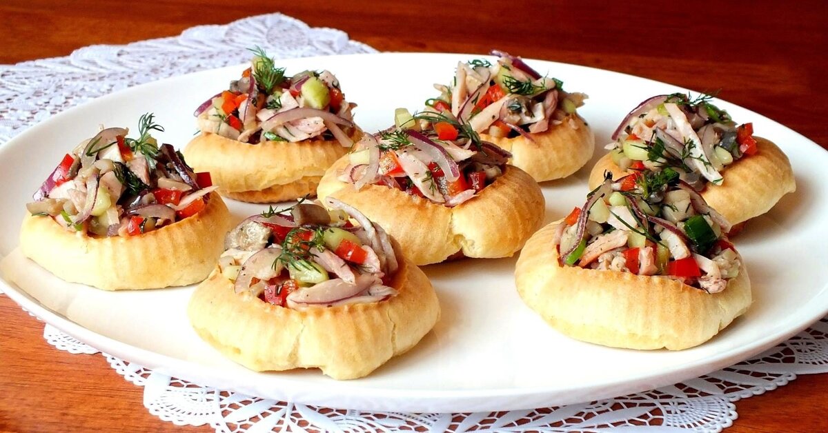 Необычные закуски - это всегда удобно. Их можно поставить как на праздничный стол, так и на семейный ужин. Они подходят для большой дружной компании и для романтического вечера. Более того, закуски - это всегда креативно, полное раздолье для фантазии хозяйки. Посмотрите несколько очень вкусных вариантов. Поповеры-тарталетки с пикантным салатом Поповеры-тарталетки внешне напоминают заварные пирожные (профитроли). У них тонкие слоистые стенки и внутри большая полость для заполнения начинкой. Они получаются воздушными и легкими, отлично подходят для оформления фуршетных закусок. Заполнять их можно любой, не слишком жидкой начинкой. В этой статье я предложу один вариант. Ингредиенты (из этого количество получается 16 шт. тарталеток):