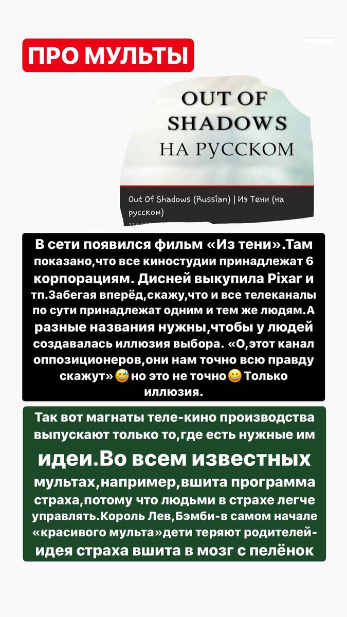 В сети появился шокирующий для многих фильм "Из тени" на русском языке. Если кратко, там про то, что вся киноиндустрия, все корпорации принадлежат всего 6 гигантам. Нам известно, что компания Disnay выкупила Pixar, также и все остальное, даже "независимое и артхаусное" кино подчинено определенным корпорациям. Для чего это нужно? ИЛЛЮЗИЯ ВЫБОРА. Также и все телеканалы, по сути, принадлежат одним и тем же людям. И, когда вы смотрите, так называемый "оппозиционный" канал, в надежде, что сейчас вам там выдадут всю правду - это тоже иллюзия. Они говорят только то, что могут сказать. А противоположные мнения на разных телеканалах и создают эту иллюзию выбора у народа, хотя за нас давно все решено!) Что касается мультфильмов? Король лев, Бэмби - в самом начале малыши теряют своих родителей. Что происходит с ребенком, когда он это смотрит? Ему становится страшно. На подсознательном уровне, просматривая эти мультфильмы, ему откладывается СТРАХ. А людьми в страхе - проще управлять. Нами с само