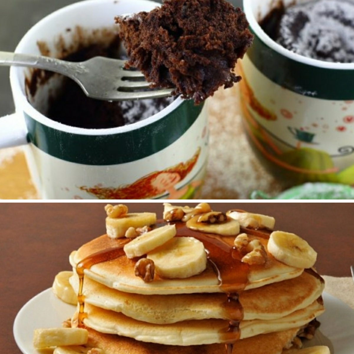 Не сложные вкусные десерты на завтрак. Порадуйте себя и своих близких. Начнём с самого лёгкого. Этот рецепт кекса заменит вам привычный кекс в кружке. Рецепт 1ый Бананово-шоколадный кекс в кружке. 1) 1 банан 2) 3 ст.ложки молока 3) 2 ст.ложки меда 4) 1 яйцо 5) 4 ст.ложки муки 6) 1 ч.ложка разрыхлитель 7) 1 ст.ложка какао Приготовление 1) Сделать банановые пюре, размер вилкой банан. Добавить мед, молоко, яйцо и перемешать. 2) Затем добавьте муку, разрыхлитель и какао. 3)Переливаем массу в кружку и ставим в микроволновку на 5 минут. Можно также растопить шоколад отдельно и полить сверху на наш кекс. Рецепт 2ой Банановые панкейки без яиц. 1) Один банан 2) 160 мл молока 3) стакан муки 4) разрыхлитель теста 1 ч.л. 5) щепотка соли 6) сахар и ваниль по желанию Необходим блендер или миксер. Приготовление: 1) Для начала берем банан и разминаем его. К нему добавляем молоко. И всё хорошо перемешиваем блендером. 2) В муку добавляем немного соли сахара (по желанию) и разрыхлител