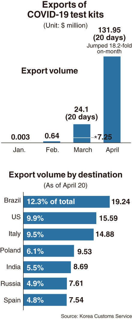 По данным Таможенной службы Южной Кореи, экспорт южнокорейских наборов для тестирования на коронавирус за первые 20 дней апреля вырос почти в 18 раз по сравнению с аналогичным периодом марта. Экспорт тестовых наборов за этот период достиг 131,9 млн долларов против 7,25 млн долларов в годовом исчислении.