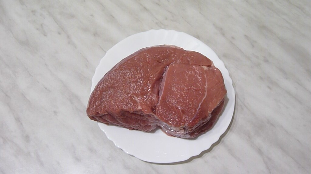 _________________________________________________________________________________________Мясо лучше брать молодое, в идеале — телятину. Конечно, лучше, если это будет мякоть без прожилок — такая единая мышца. Можно будет сделать ровный, красивый срез и в заливном это будет красиво выглядеть. В зависимости от количества порций, мяса я беру либо килограмм, либо пол килограмма. Мою его холодной водой.