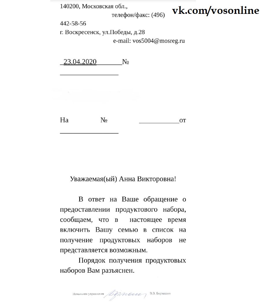 Социальная защита города Воскресенска Московской области отказала без объяснения причин одинокой матери (отец ребенка умер) в получение бесплатного губернаторского продуктового набора,