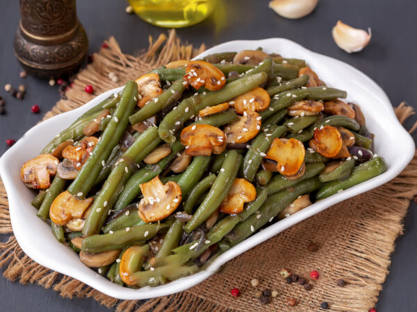 Замороженная стручковая фасоль, обжаренная с грибами и чесноком, в солено-сладком соусе - это вкусный гарнир или легкий ужин за 20 минут. Возьмите ингредиенты для приготовления жареной стручковой фасоли с грибами (шампиньонами). Замороженную стручковую фасоль ополосните холодной водой и процедите, чтобы удалить частички льда с поверхности. Протрите грибы бумажной салфеткой, а затем очистите, сняв верхний слой кожицы и обновив срез на ножке. Очистите лук и чеснок. Ингредиенты: Заправка: Время приготовления: 20 минут, 55 кКал Рецепт: Нарежьте лук тонкими полукольцами или четвертинками. Мелкие грибы нарежьте половинками или четвертинками, более крупные - пластинками. Мелко нарежьте чеснок. В большой сковороде, на сильном огне, разогрейте растительное масло. Добавьте замороженную стручковую фасоль и обжарьте 3-4 минуты. Затем добавьте нарезанный лук и грибы. Помешивая, обжарьте всё еще 10 минут или чуть дольше, до желаемой степени готовности (мягкости) овощей и грибов. Приготовьте со
