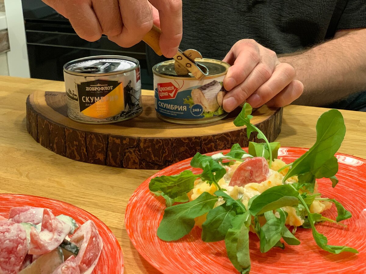 Обе консервы куплены в Пятёрочке со скидкой. Причём одна из них «Красная цена»