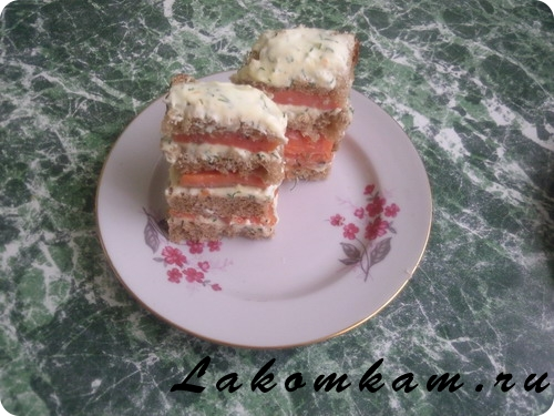 Закуска «Бутербродики с копченым лососем». Ингредиенты: сливочный сыр — 200 грамм; лимонный сок — 2 чайные ложки; пучок укропа; щепотка соли; щепотка молотого черного перца; ржаной хлеб — 6 больших кусков; копченый лосось — кусочки.
