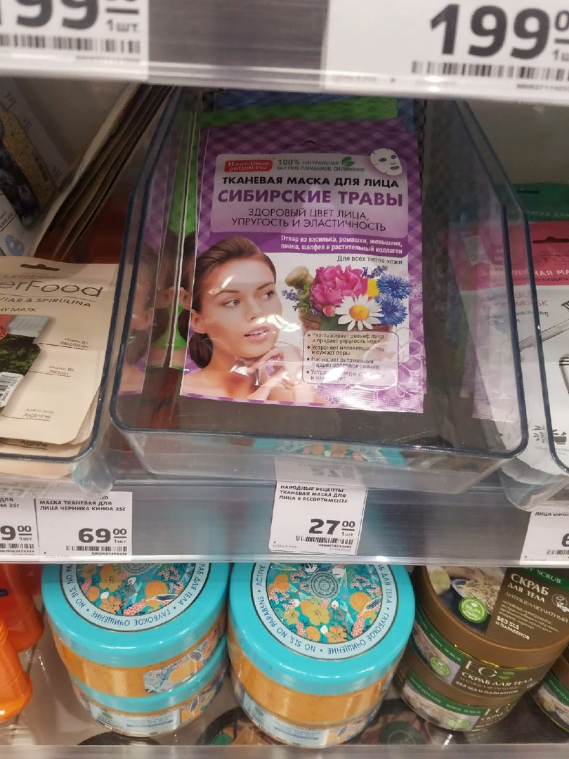 В магнит-косметик я не была уже больше месяца. У нас этим магазины некоторое время были закрыты, и все необходимые вещи приходилось покупать в других магазинах. Но сегодня он работает и снова можно делать выгодные покупки! Не со скидкой, но просто по очень хорошей цене можно взять тканевую маску для лица. Всего 27 рублей! Редко можно встретить такую цену на данный продукт. Со скидкой взять можно и не тканевую маску для лица от черного жемчуга с двумя этапами ухода. Скидка в 40% - 47 рублей за одну маску. С такой же скидкой и целый ряд уходовых средств марки Черный жемчуг - крема для разных возрастов от 125 рублей. Скидка от 40%. Корейская пенка для очищения кожи за 259 рублей. У меня такое средство уже есть, хорошо очищает, так что рекомендую! Цена выгодная! Выгодная цена была и на продукцию Котекс. Тампоны 16 шт - всего 119 рублей. Прокладки 7 штук - 69 руб, большая упаковка -119 рублей. По акции 2=1 краска для волос разных оттенков от Syoss - 347 руб. 30% Скидка на краску Гарньер - 1