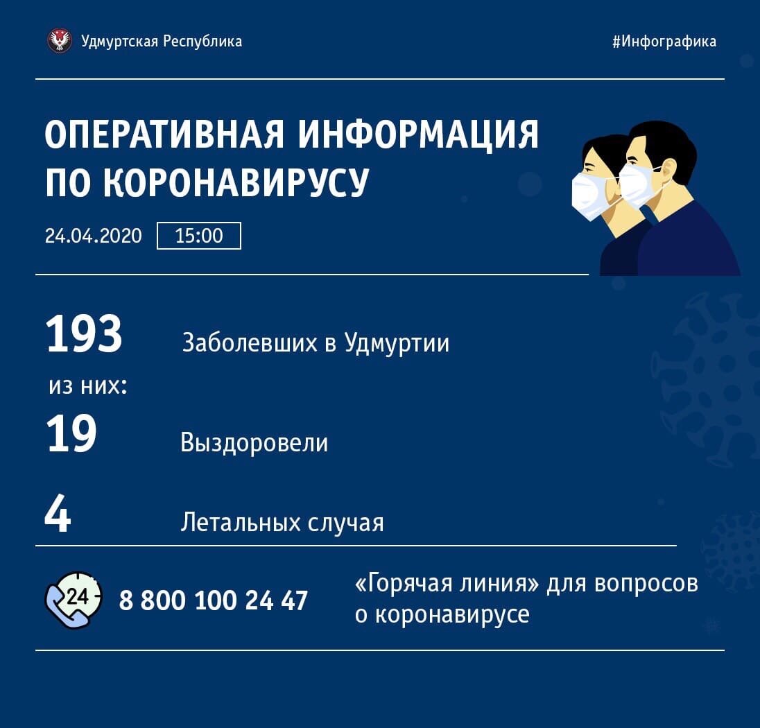 На 24 апреля зарегистрировано в общей сложности 193 подтвержденных случая заражения новой коронавирусной инфекцией. 19 человек выздоровели, 4 летальных случая. Источник: Коронавирус. Оперштаб Удмуртии