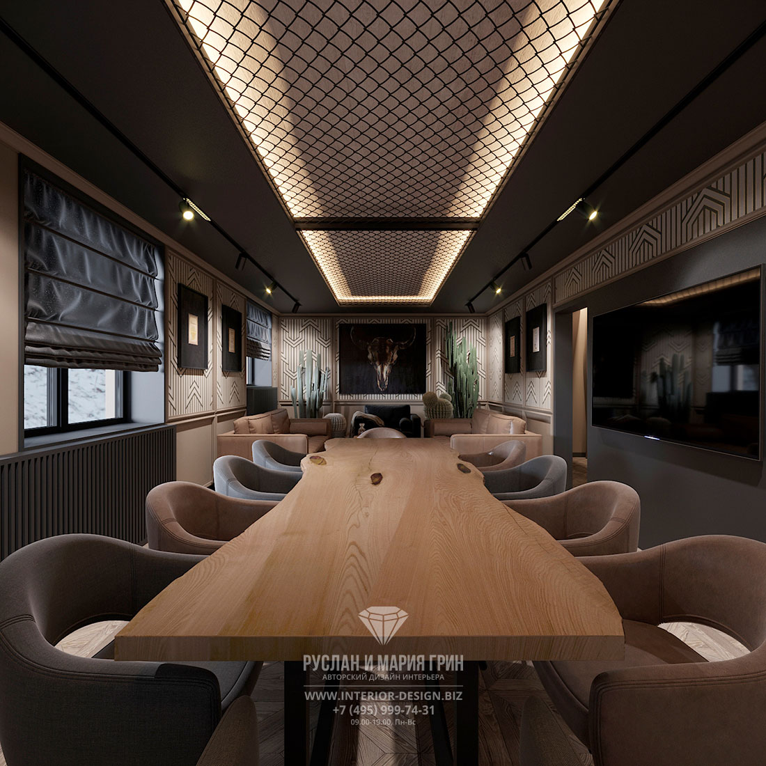 Сдержанная цветовая гамма, обои с геометрическим принтом, кожаная мебель, стилизованные охотничьи трофеи — разработанный нашей студией проект интерьера переговорной в офисе автосалона демонстрирует брутальный мужской характер. Современный интерьер переговорной с этническим колоритом На общую концепцию «работает» и авторский потолочный светильник с декоративным экраном из металлической сетки. А выразительный контраст, который создают светлый паркет и темный потолок, делает обстановку динамичной. Помещение ненавязчиво обособлено от коридора перегородкой с телевизионной панелью и визуально разделено на три зоны: совещательную, лаунж и бар. Первые две украшают дизайнерские столы со столешницами из слэбов вековых деревьев. Они добавляют в интерьерный ансамбль харизмы и отлично справляются с ролью арт-объектов. А зона бара с закрытой системой хранения и подсвеченным светодиодами винным шкафом выглядит максимально лаконично и респектабельно. В этом дизайн-проекте присутствует едва уловимый