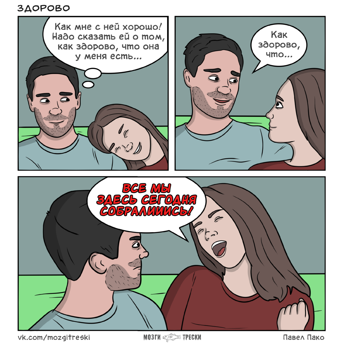 Начну я, пожалуй, с комикса, который я когда-то нарисовал для своего личного проекта Мозги трески - посвящен он людям, которые любят заканчивать фразы песнями. Кстати говоря, эта зарисовка основана на реальных событиях, ну а песня, которая в ней упоминается, носит название «Как здорово» и впервые была исполнена Олегом Митяевым.