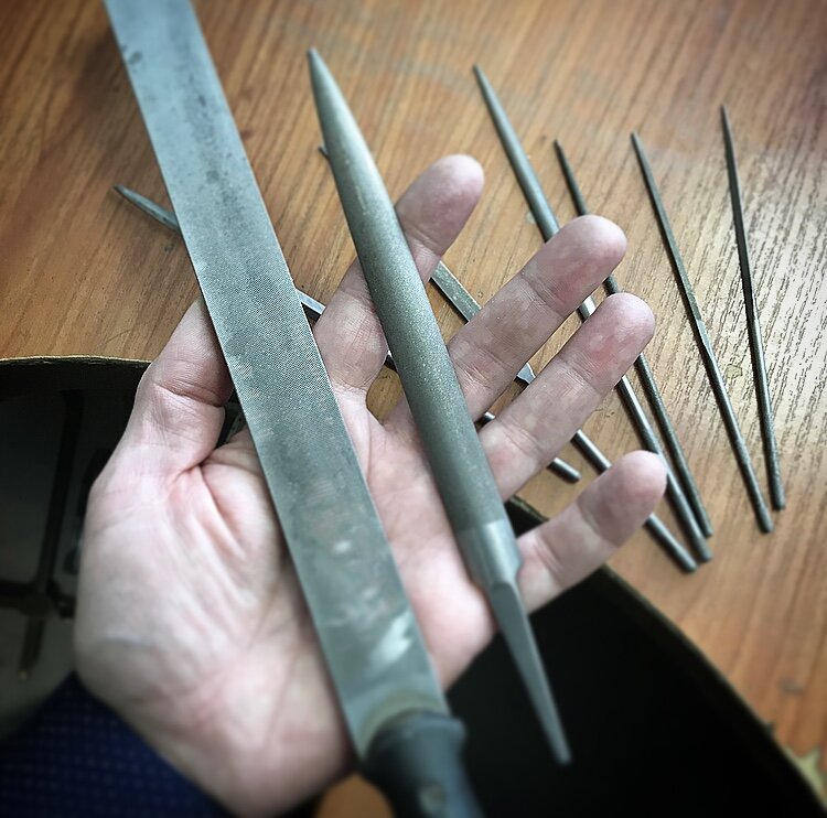 Дорогу осилит идущий... Рад всех приветствовать. Сегодня поговорим об обработке заготовок , деталей и полуфабрикатов. Это такие операции как : 1).Обдирка, 2).Шлифовка. (Есть ещё номер 3).Полировка, но её мы коснёмся в другой раз . ) Помогут нам в этом деле следующие инструменты- Крупный плоский и полукруглый напильники. Для первичной , грубой обработки, снятия заусенцев и придания нужного рельефа, я использую их. Далее- Для более тонкой доводки я использую надфили разного профиля. надфилями со сферическими поверхностями удобно обрабатывать изделие изнутри. Плоскими я работаю по наружным поверхностям. Для завершения процесса шлифовки использую наждачную бумагу от грубой до мелкой. У меня это от180 номера до 2000го. Друзья на сегодня всё, не расходитесь завтра балет нщё интереснее! Полировка и бормашина!
