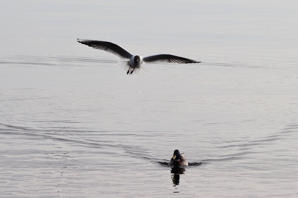 Как то раз, мы пошли на прогулку, захватили с собой остатки батона. Планировали покормить на озере уток. Уток не было, лишь недалеко от берега плавал одинокий селезень. Он увидел, что мы кидаем в воду хлеб и направился в нашу сторону. Однако озерные чайки оказались быстрее и проворнее. Пока селезень осторожно приближался к берегу, чайки, как пикирующие бомбардировщики налетели кучей и расхватали весь хлеб. Селезень, похоже даже немного испугался такого натиска и пока чайки не улетели, держался в отдалении. В Карелии встречается 6 видов чаек: озерная чайка, сизая чайка, клуша, серебристая чайка, большая морская чайка и малая чайка. Самые массовые виды – это озерная чайка и сизая чайка. Если вы видите чайку в Петрозаводске и его окрестностях, то это скорее всего или та, или другая. Озерных чаек легко узнать по черной маске на голове, а сизых чаек по сизому окрасу крыльев. Клуша в окрестностях Петрозаводска встречается, но не часто. Я видел эту птицу несколько раз, но только издале