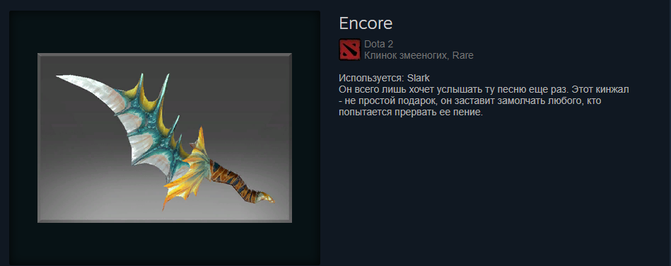 Доброго времени суток, сегодня я продолжаю похождения по недрам Торговой площадки и ищу для вас вещицы с интересной историей и уникальностью. Начнем с милой и романтической истории. В Лоре доты упоминается о связи Slark и Naga Siren. Если кто не знает, то Сларк влюблен в Нагу и в своих репликах проявляет к ней повышенный интерес. Так вот к чему я это, в Доте есть одна неприметная вещица под названием "Encore" Это кинжал на Сларка который существует с 2015 года. Но его особенность в его дизайне. Если присмотреться то видно, что его рукоять в точности повторяет "прическу" Наги. Но это не все, если прочесть описание этого клинка, то мы видим, что и сама Нага Сирен была не против ухаживаний Сларка. ....Этот кинжал не просто подарок... То есть получается, что Нага подарила ему кинжал, дабы Сларк всегда слышал и помнил о том как она поет и мог ее защитить.