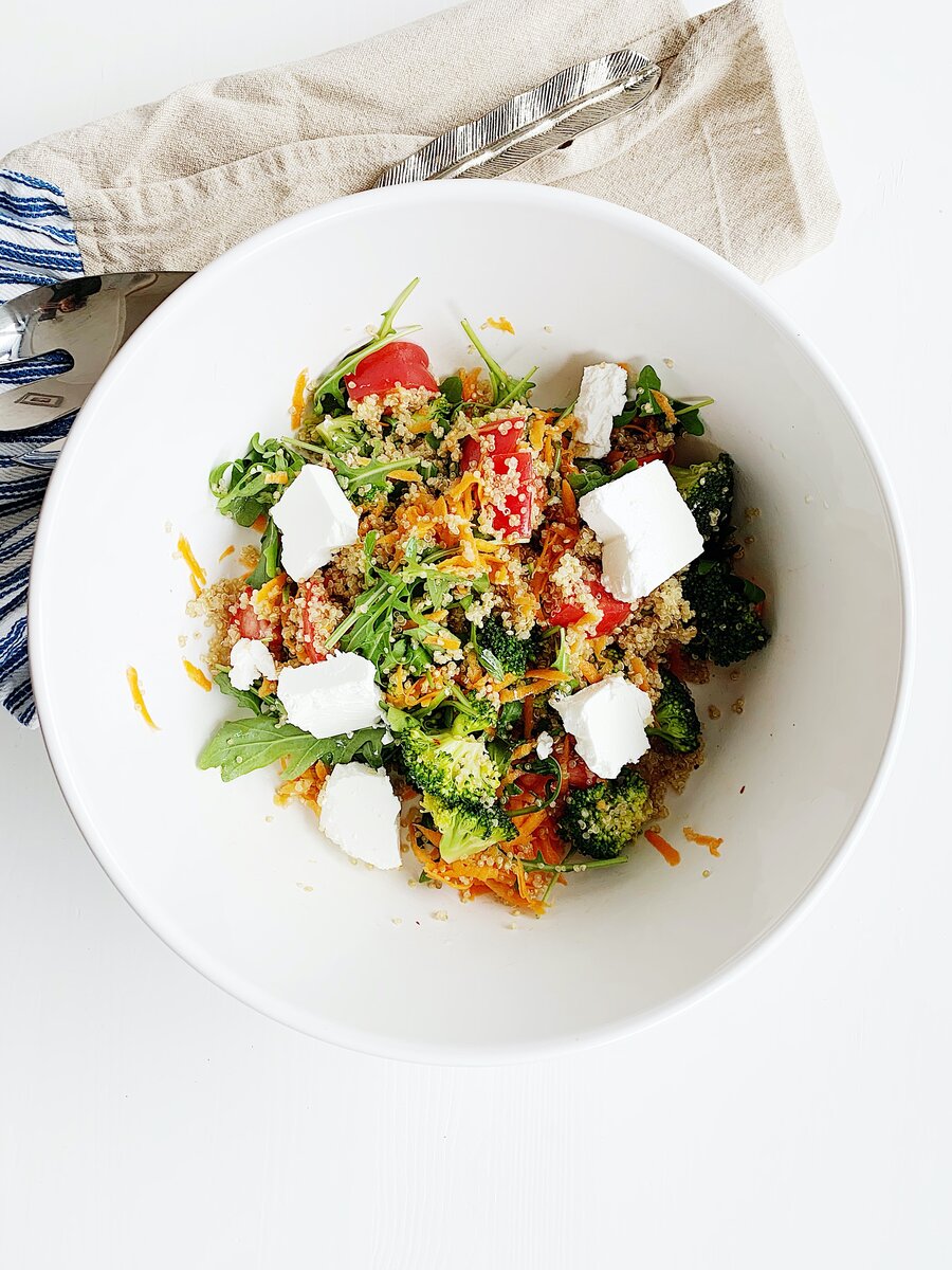 Если на карантине одолела грусть, на помощь придут яркие овощи и витамины. Фейерверк красок на тарелке поможет отвлечься от плохих новостей, а заодно укрепит иммунитет. Для салата понадобится 15 минут и овощи. Ингредиенты: Шаг 1 Поставьте вариться киноа. Обычно на упаковке написано соотношение 1 части крупы к 2 частям воды, но для киноа лучше использовать соотношение 1 к 2.5, так будет сочнее. Пока киноа варится, приготовим заправку. Для нее натрите цедру половины лимона и выжмите сок. Шаг 2 Добавьте в лимонный сок соль, перец, оливковое масло и измельченный в чеснокодавке чеснок. Размешайте и отложите в сторону. Шаг 3 Залейте крутым кипятком брокколи и дайте постоять 5 минут. После чего промойте холодной водой, это поможет сохранить капусте яркий цвет. Шаг 4 Натрите на крупной терке свежую морковь. Шаг 5 Выложите капусту на дно глубокой салатницы. Добавьте заправку и хорошо размешайте. Начинать заправку нужно с брокколи, так как это самый пористый овощ и он придаст сочность всему сала
