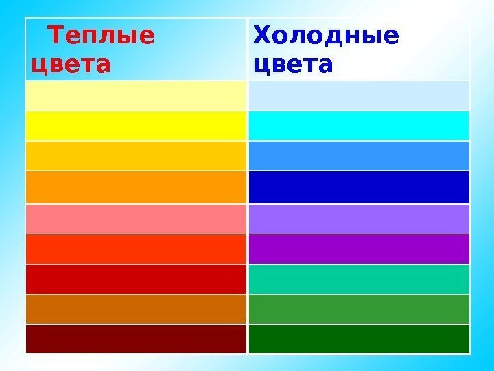 Сегодня мы поговорим о различии тёплых и холодных цветов, какие цвета ахроматические, а какие хроматические. Тёплый и холодный цвет связывают с атрибутами времени года. Холодными называют, такие оттенки, которые чаще всего мы видим зимой, а тёплые — летом. Однако распознавание строится на длине волны спектра: чем короче волна, более холодным мы ощущаем цвет, и наоборот: чем длиннее — тем теплее. Мы не можем увидеть волновое колебание спектра, поэтому опираемся на косвенные показатели: — под воздействием длинной волны мы чувствуем усиление сердцебиения, дыхательного ритма, прилив крови, а значит изменяются тепловые ощущения: окружающая среда кажется теплее, чем она на самом деле есть, поэтому цвета с длинной волной называют теплыми. — при воздействии короткой волны мы чувствуем замедление сердцебиения, расслабление, замедление дыхания, отлив крови, что ведёт к ощущению холода. Такие тона называют холодными. Средняя длинна в спектре, минимально воздействует на жизненные показатели и счи
