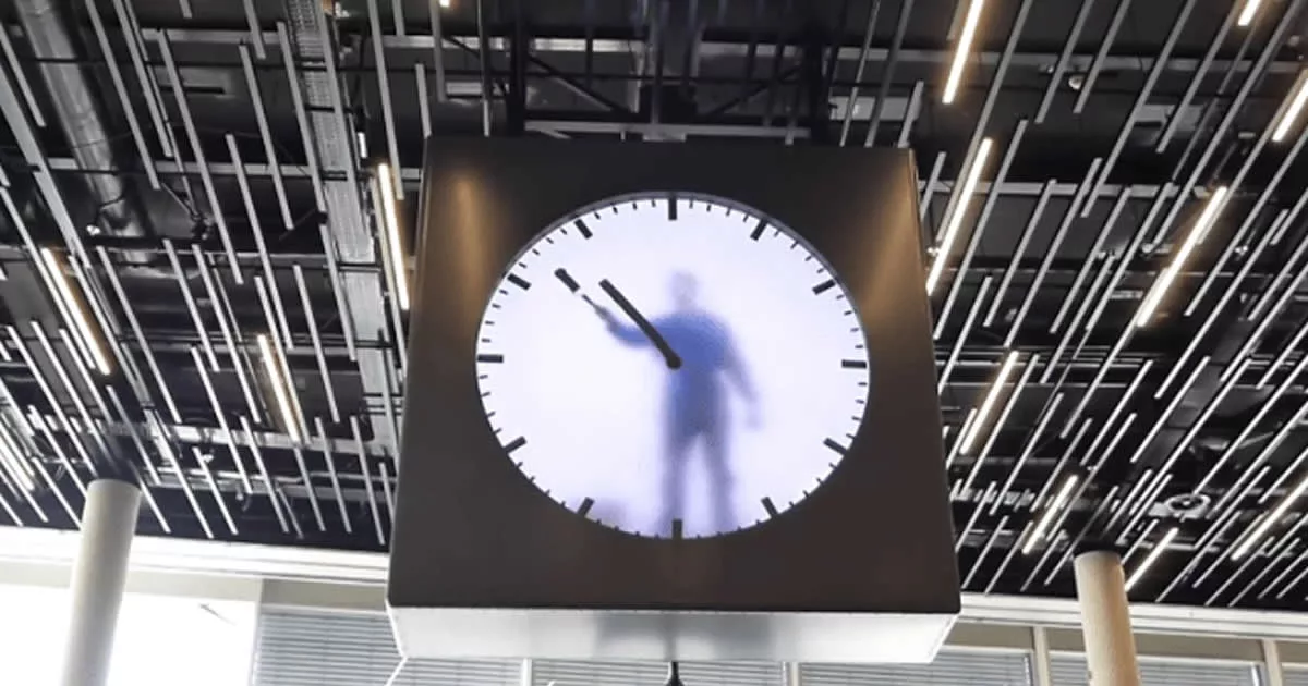 Оказавшись в аэропорту Амстердама, вы можете заметить необычные часы, установленные под самым потолком здания. Кажется, внутри них сидит человек… Что за трудолюбивый бедняга, без устали рисующий и стирающий стрелки, заперт в механизме? Но, конечно, это всего лишь замкнутый по кругу видеоролик, который выглядит пугающе реалистично. Впрочем, чтобы записать его, дизайнеру Маартену Баасу пришлось действительно сделать видео с полным циклом хода часовой и минутной стрелок по циферблату. Необычная затея пришлась явно по душе гостях аэропорта, то и дело притягивая к себе удивленные взгляды.