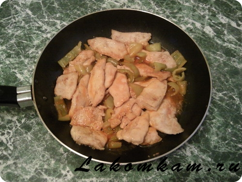 Блюдо из мяса «Куриное филе в горчице». Ингредиенты: куриное филе — 400 грамм; перец болгарский — 1 штука; чеснок — 1 зубчик; горчица — 2 столовые ложки; томатная паста — 2 столовые ложки; вода — пол стакана; соль по вкусу.