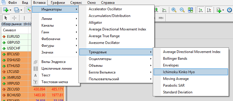 Для установки Ichimoku в вашем терминале Meta Trader 4, либо в пятой версии, вы выбираете в меню