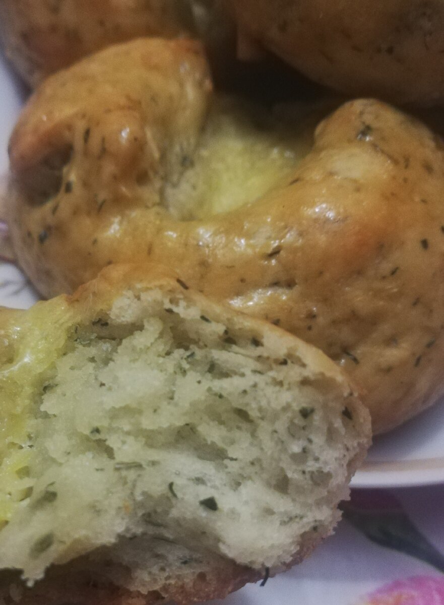 Вкусные помпушки к супу или просто вместо хлеба. В моей семье улетают на раз. Ловите рецепт. Нам понадобятся: Чеснок - 1 зубчик Масло сливочное - 60 гр. Молоко - 140 гр. Дрожжи сухие - 5 гр. Соль - 0,5 чайной ложки. Сахар - 0,5 чайной ложки. Мука - 220 гр. Смесь кавказских трав - 1 чайная ложка. Укроп сушеный - 1 чайная ложка. Начнем готовить... Готовим чесночное масло: 40гр. масла растопить (я топлю в микроволновки) и смешать с натертым чесноком. Отставляем в сторону. Готовим тесто: Дрожжи смешать с солью, с сахаром и с теплым молоком. Оставить на 20 минут. Муку смешиваем с травами и с укропом. В молоко с дрожжами постепенно вводим смесь муки с травами. Добавляем оставшееся масло и замешиваем тесто. Оставляем тесто на 1 час в теплом месте, накрыв миску пищевой пленкой. Поднявшееся тесто, делим на 6 кусочков, оставляем на 15 минут. Формируем шарики, переносим на противень покрытый бумагой для выпечки и опять оставляем на 20 минут. Сделать в булочках разрез и выложить в каждую ост