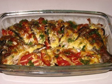 Теперь выкладываем кусочки карпа сверху на картофель, сохраняя форму целой рыбки.