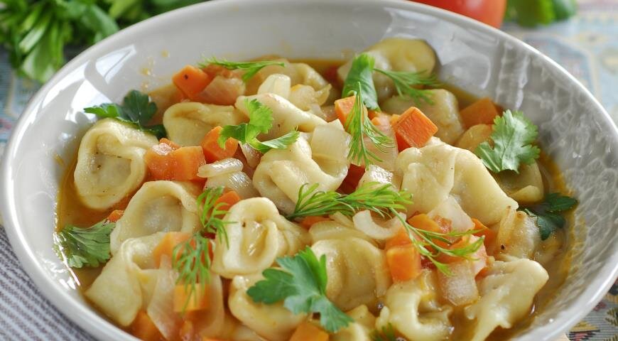 ⠀В фарш добавляем лук, специи и соль. Раскатываем тесто, нарезаем на квадратики, кладём мясо и лепим пельмени. Обжариваем поочередно лук, болгарский перец и помидор, добавляем стакан воды и тушим 15-20 минут. Варим пельмени и выкладываем на них подливку. ⠀