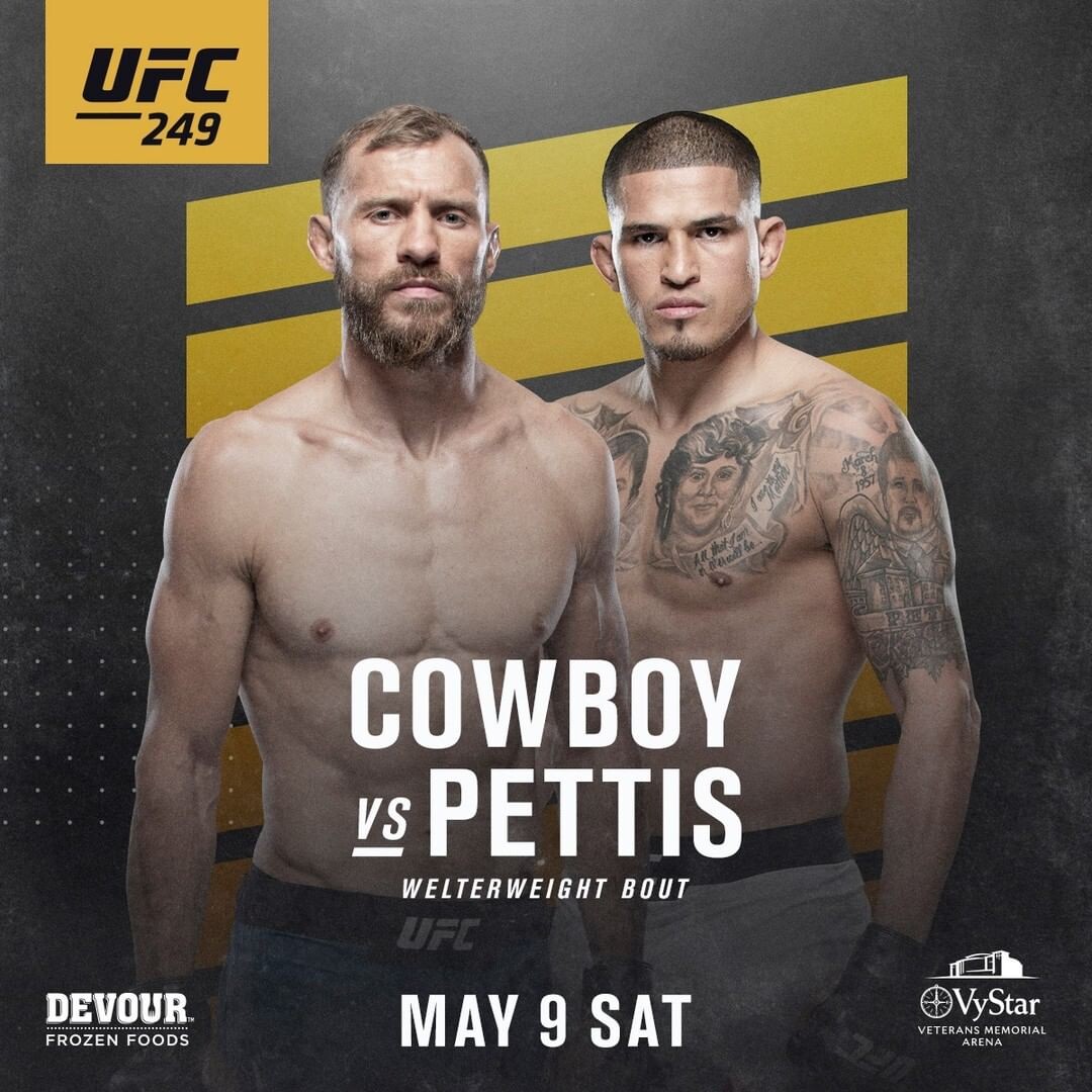 Ниже представлены главные бои грядущего вечера. Точное место проведения перенесенного с 18 апреля бойцовского турнира не уточняется. Главным событием UFC 249, как и планировалось, станет поединок Тони Фергюсона с Джастином Гэтжи, который заменил не имеющего возможности покинуть Россию во время пандемии Хабиба Нурмагомедова. По данным MMA Fighting, турнир пройдет в одном из городов штата Флорида. Ранее UFC 249 пытались провести на территории индейской резервации, однако в последний момент власти Калифорнии потребовали отказаться от этой идеи. Пока известно, что перед началом турнира, который теперь назначен на 9 мая, все бойцы съедутся в Джексонвиль. Напомним, до этого руководство UFC официально перенесло остальные четыре турнира, которые должны были пройти в апреле и мае. Президент UFC Дана Уайт тщательно скрывает конкретную локацию, поскольку уже научен горьким опытом: предыдущая попытка провести UFC 249 — в индейской резервации, на территории которой не действуют федеральные з