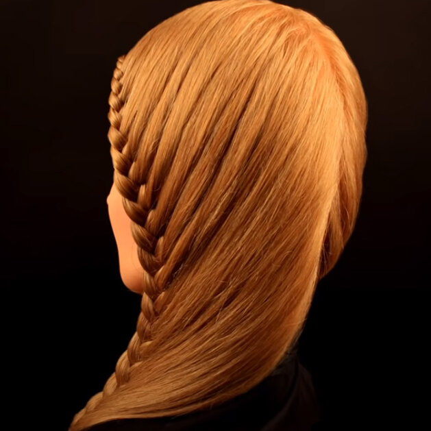 Эта эффектная прическа делается очень просто. Две косы плетем по линии роста волос, и готово! Шаг 1: Волосы делим прямым пробором на две части, закалываем зажимами. Шаг 2: По линии роста волос с левой стороны у пробора выделяем неширокую треугольную секцию, делим ее на три пряди. Из них начинаем плести обычную косу (выполняем одно переплетение). Шаг 3: Продолжаем плести обычную косу, подхватывая пряди волос с одной стороны. Левую прядь косы заплетаем без подхвата, то есть просто переплетаем ее со средней прядью. Правую прядь косы плетем с подхватом, то есть укладываем ее на среднюю прядь, потом из свободных волос справа отделяем новую прядь и соединяем ее с правой прядью косы. Шаг 4: Продолжаем плести косу с подхватом с правой стороны вдоль всей линии роста волос. Шаг 5: Оставшиеся свободные концы волос заплетаем в обычную косу. Закрепляем концы левой косы резинкой. Шаг 6: На правой стороне выполняем такое же плетение с подхватом с одной стороны, но теперь правую часть косы