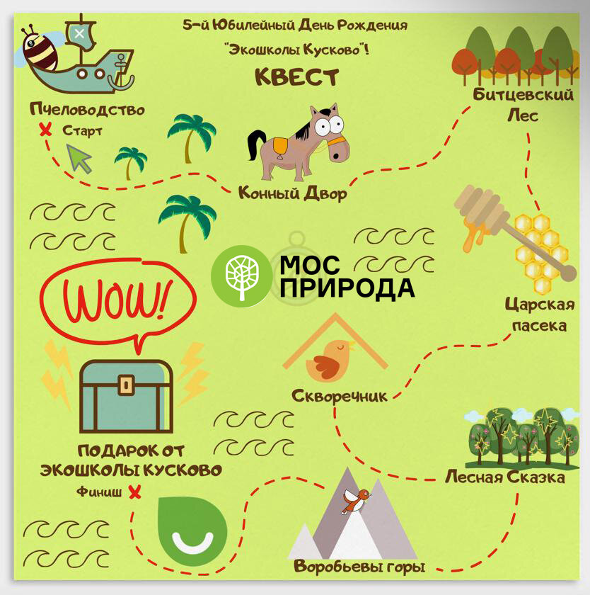 Сегодня вам предстоит, не выходя из дома, посетить 8 экоцентров Мосприроды и разгадать, какое поздравление зашифровано в ребусах. 25 апреля - день рождения экоцентра «Экошкола Кусково» Мосприроды. Эколого-просветительский центр так ждал этого праздника, ведь у него юбилей! Пять лет! Экошкола хотела грандиозно его отметить, позвать гостей и все экоцентры «Мосприроды» в гости. А главное - получить много приятных поздравлений. Но случилась непредвиденная ситуация. К сожалению, никто не сможет прийти на день рождения и поздравить «Экошколу Кусково»! Но можно это исправить, не выходя из дома. Отправляйтесь в путешествие по экоцентрам Мосприроды, отмеченным на карте, и соберите все поздравительные слова, чтобы передать их Экошколе! Только вот незадача: из-за сильного ветра все буквы перепутались и оказались зашифрованными в ребусах. Ваша задача: 1. Перейти на страницу аккаунта Мосприроды в Инстаграме (@mospriroda): 2. Затем отправится в путешествие по экоцентрам Мосприроды строго по кар