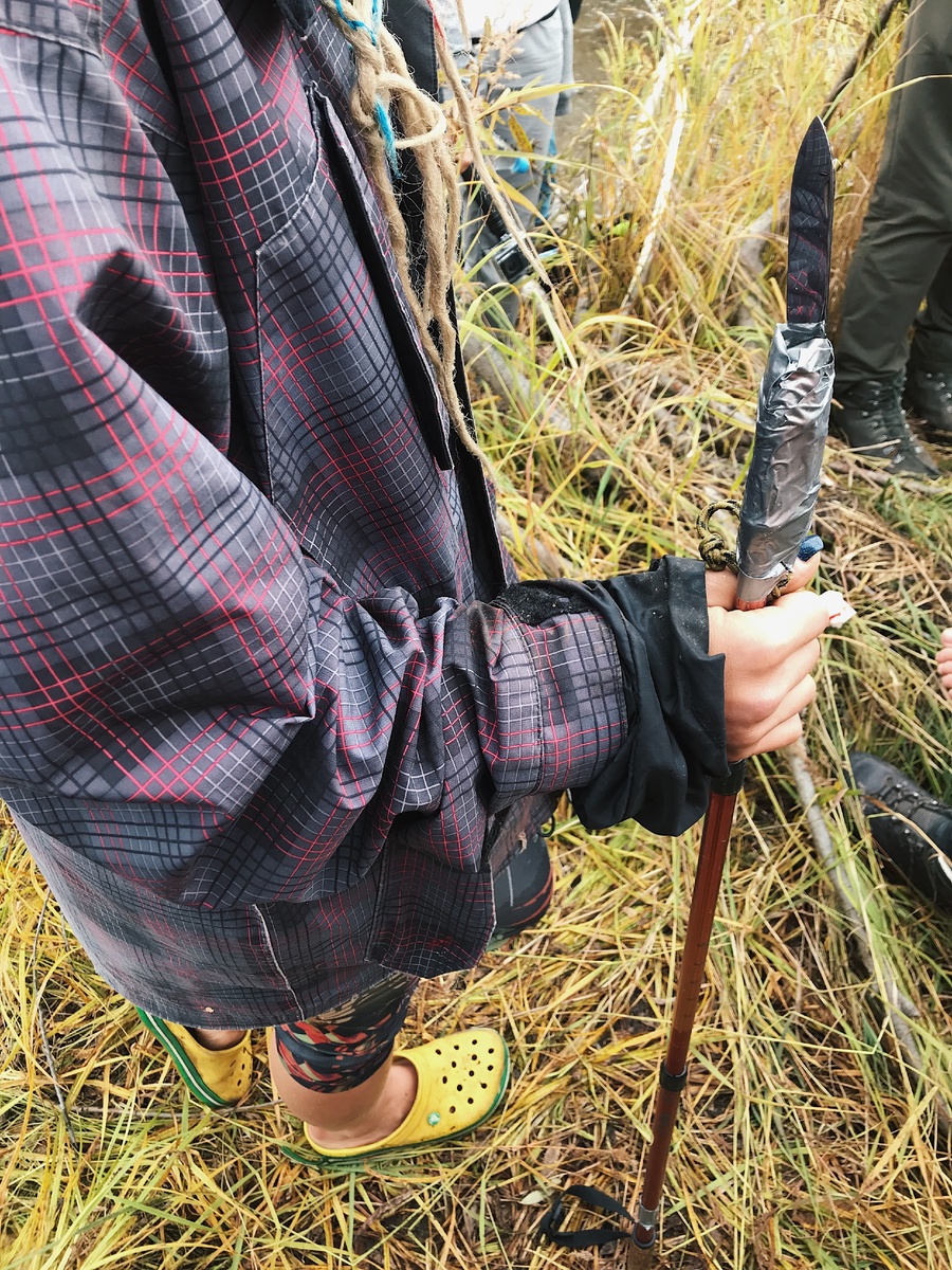 Как нам говорили, на Камчатке во время нереста рыбу можно голыми руками ловить, вода от нее так и бурлит. Мы же припозднились, были в не сезон, да и рыбачить как-то не планировали, но сложно, увидев в речке вальяжно плавающих и блестящих на скудном солнце рыб, не захотеть туда залезть по пояс, несмотря на то, что она ледяная – осень на дворе! Попытки поймать бодро снующих рыбин руками сразу были отбракованы, хотя по ходу ловли то и дело предпринимались, и мы, задействовав инженерную мыслю русского человека, решили использовать подручные средства. Представляю вам их топ! (настоящие рыбаки и выживальщики не смотрите дальше!) Треккинговая палка, моток изоленты и нож = что-то между копьем и гарпуном. И, возможно, у Кристофера МакКэндлесса подобное бы и прокатило, у нас – увы, нет. Признаю, на "рыбалку" мы ходили два раза. Первый был совсем неудачный, у нас с собой не было н и ч е г о, так как просто вышли на погулять из лагеря. Поэтому представляю вам наше самое дикое изобретение! Да.